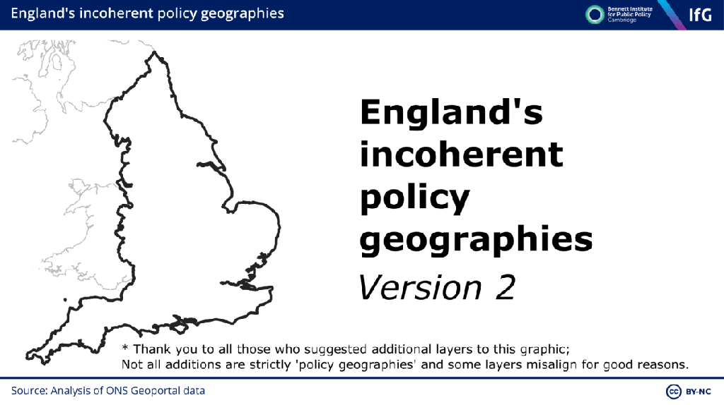 This graphic shows 13 policy geographies layered on top of each other, demonstrating the misalignment between them. It was produced as part of a 2023 report on ‘Devolving English Government‘ for the Institute for Government and Bennett Institute for Public Policy.