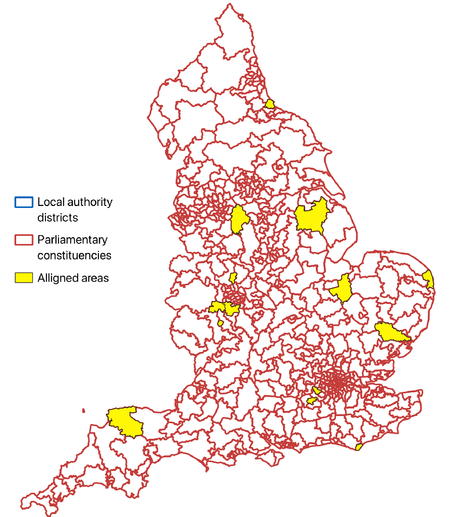 This graphic shows England’s 543 Westminster Consituencies in red and its 296 Local Authority districts in blue. They are relatively similar in scale but their borders largely misalign. The few that do align are highlighted in yellow. There are various possible advantages and disadvantages of this misalignment, but it certainly complicates potential collaboration between local and national politicians.