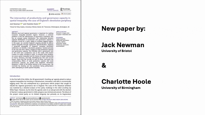 This graphic shows the spatial inequalities in productive capacity and governance capacity across England’s emerging devolution geography. The graphic summarises the findings of a recent paper: Newman, J. & Hoole, C. 2024. ‘The intersection of productivity and governance capacity in spatial inequality: the case of England’s devolution periphery’. Contemporary Social Sciences.
